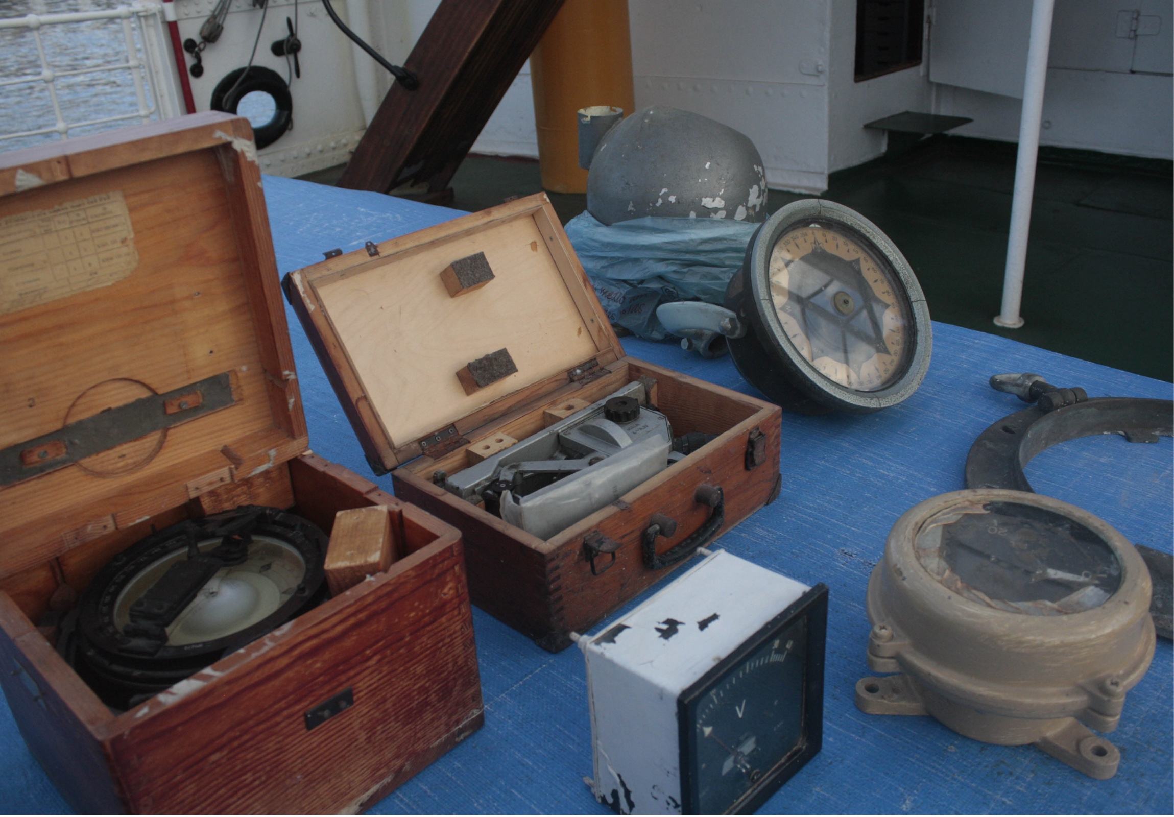 Se trata de dos piezas de fabricación soviética (un sextante y una alidada) en perfecto estado de conservación (incluso con su manual de instrucciones en cirílico); un compás magnético para botes salvavidas; un contador de corredera náutica, un voltímetro, un repetidor de compás y un tifón con origen en Malmö, Suecia.
